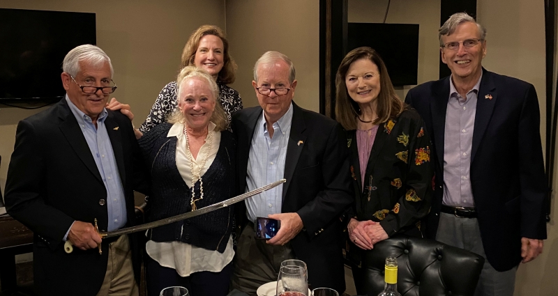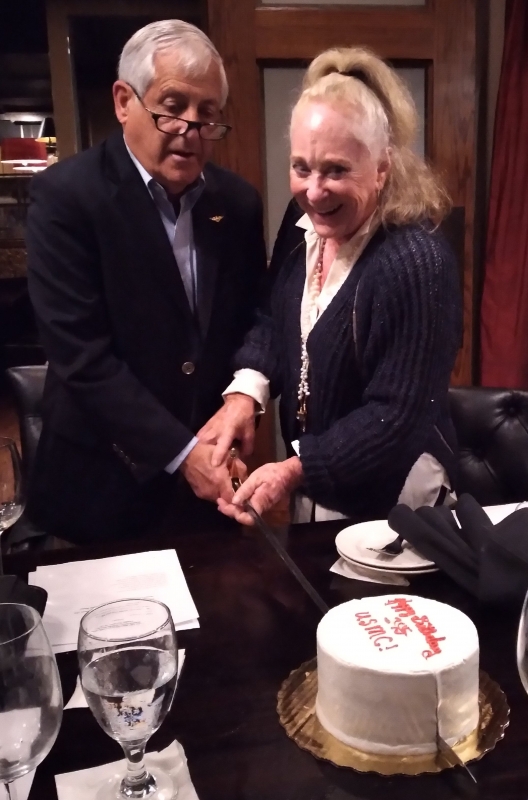 Our newest member Marine Colonel Ted Robinson and his wife Mary, hosted fellow Marine Warren Boyer and fiancee Diane Womack to a dinner celebrating the Marine Birthday with full honors to the ceremony including the reading of the Commandant's message, cake cutting and ceremonial presentation of the first slice to the junior by the senior Marine. Tom Denegre and Greta Gray were honored to have been invited to participate.