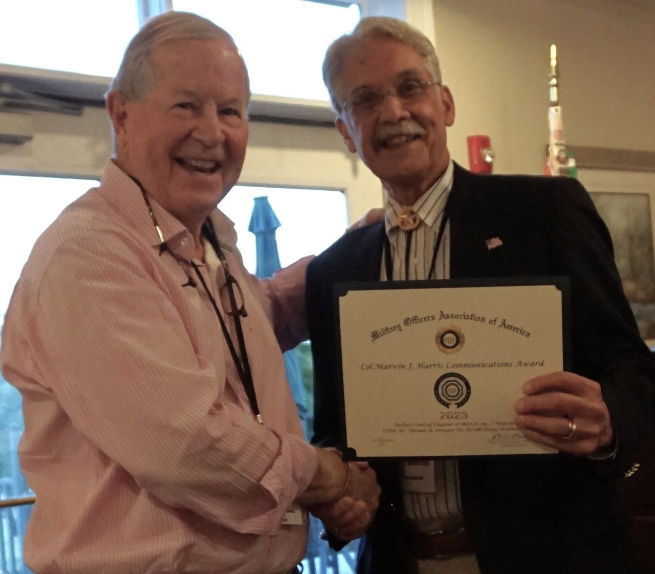 President Phil Briscoe presented the MOAA National Five Star Certificates for the "Col Marvin J Harris Communications Award" for 2023 to our Newsletter Editor, Greg Chase, and Webmaster, Tom Denegre